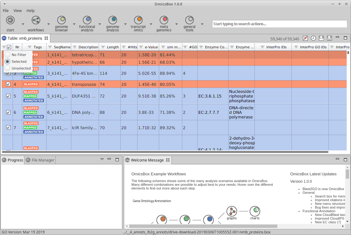 - Sequence Description. OmicsBox allows to (de)select sequences according to Blast result description.