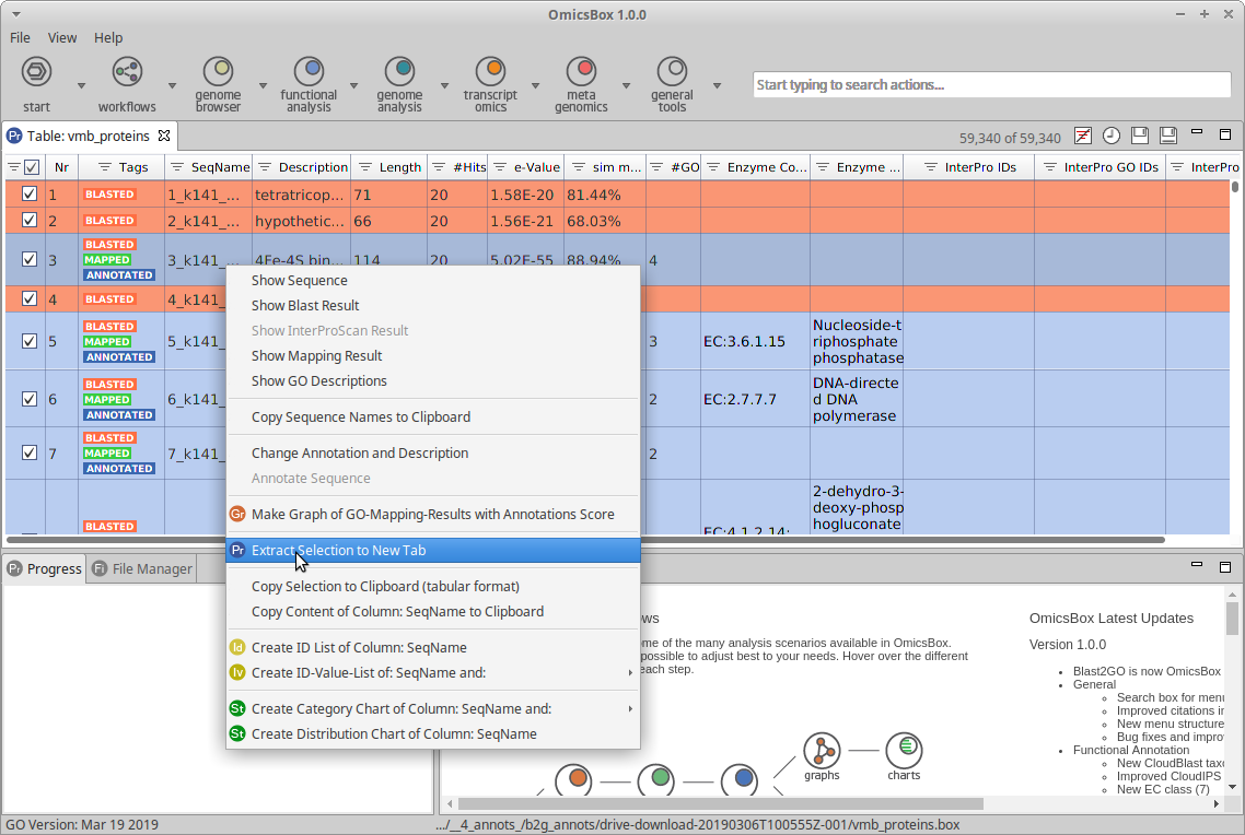 There are different functions for selecting and deselecting sequences. Most functions in OmicsBox are only applied to selected elements. Selections allow to create subset or apply certain functions to parts of a given dataset.