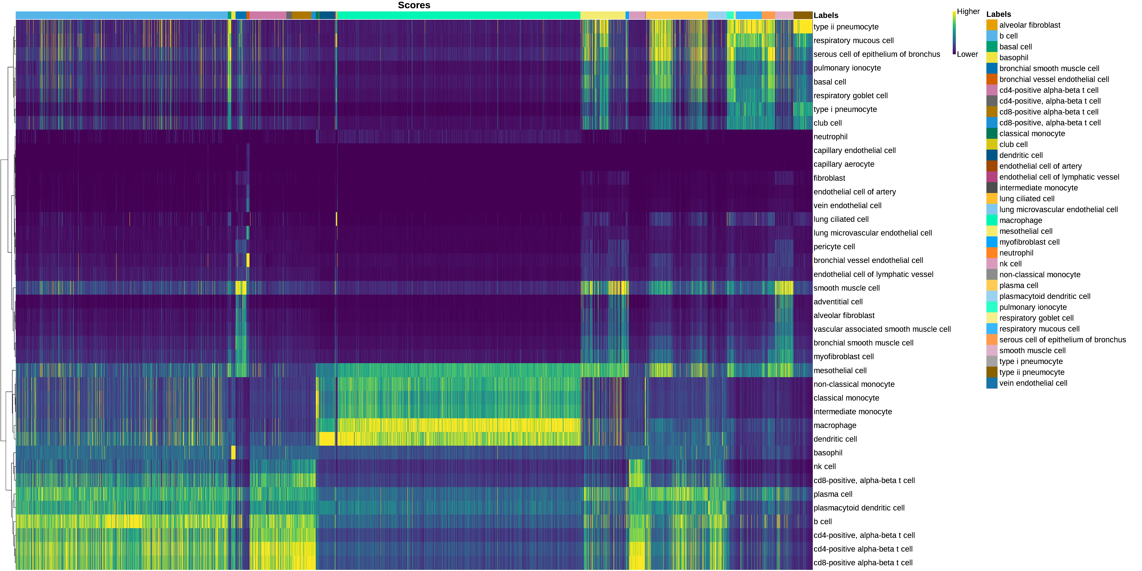 Figure 7. Score heatmap with cells in columns and labels in rows. The value is the score given for a particular cell-label pair. The labels displayed on the top legend are the final label assignment.