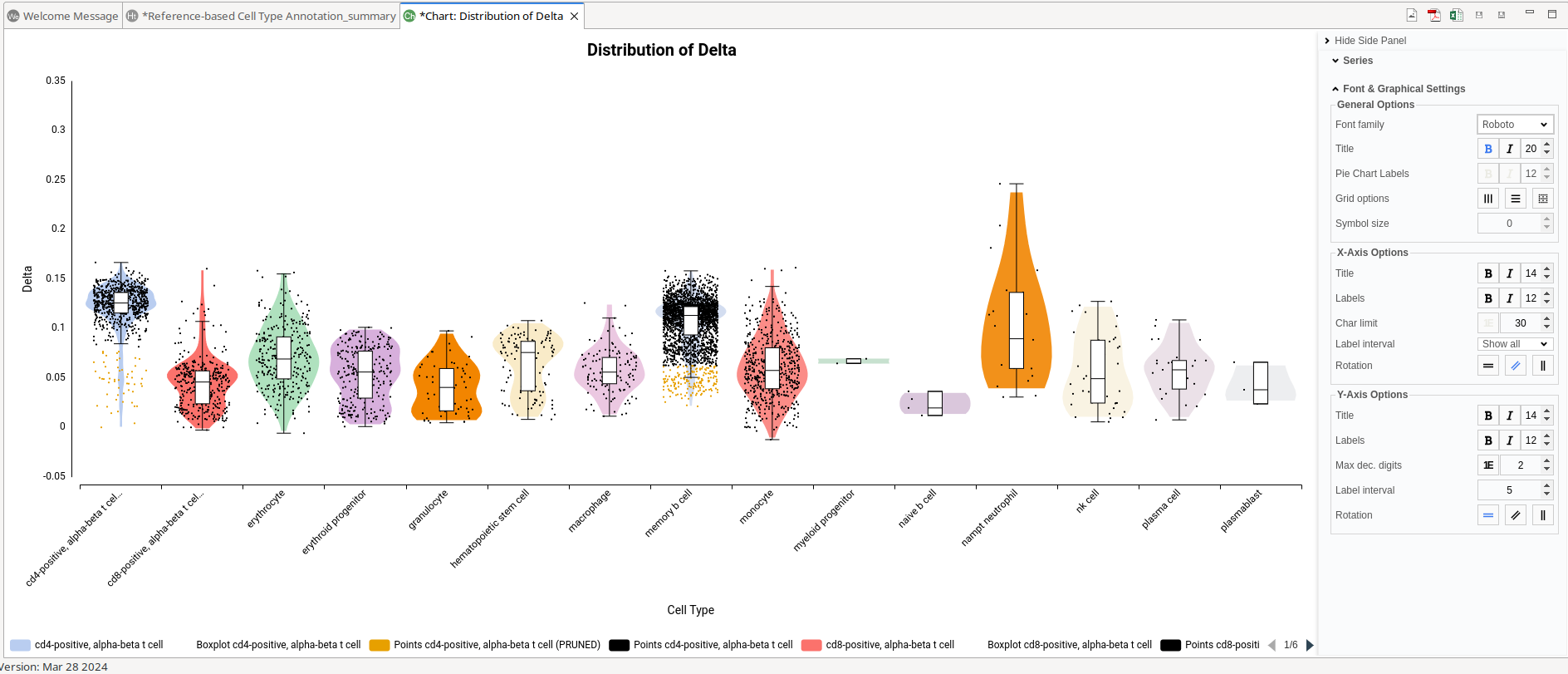 For each predicted cell type, a violin plot showing the delta score distribution is shown (Figure 6). Each violin plot contains only the cells assigned to that label. The dots (cells) colored in yellow represent cells that have been pruned. Please see the above "Pruning Parameters" section for a more detailed description of the delta score and the pruning procedure.