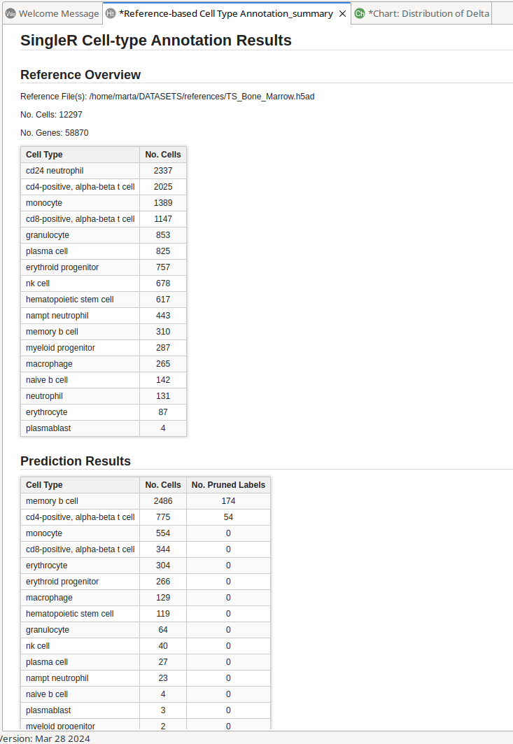 This summary (Figure 8) provides a basic overview of the reference scRNA-Seq annotation used for prediction. It shows the number of cells, genes, and the number of cells for each cell type. In addition, the number of cells in the query assigned to each cell type is also displayed, along with the number of pruned cells.