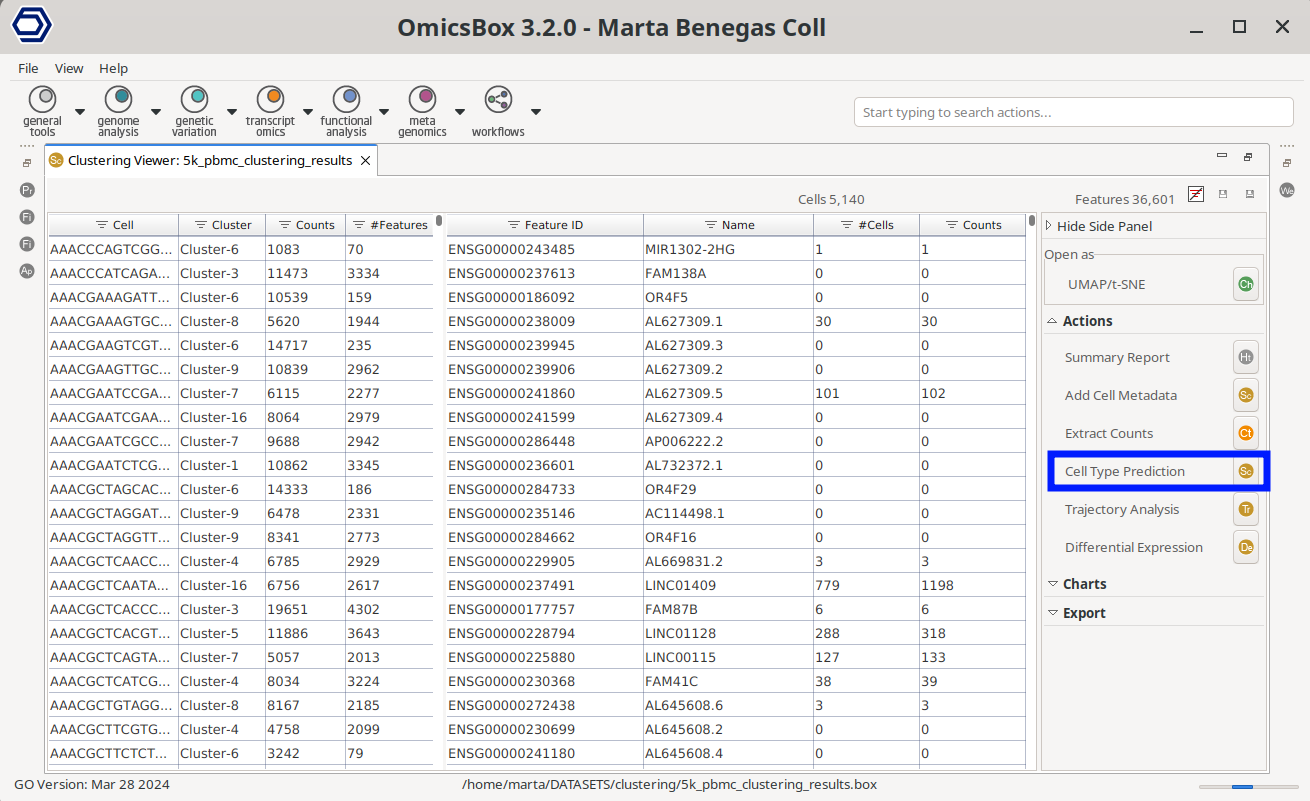 - OmicsBox File. A .box file containing a Single-cell Annotated object, which can be the result of a Clustering, Cell Type Prediction, or Trajectory analysis.