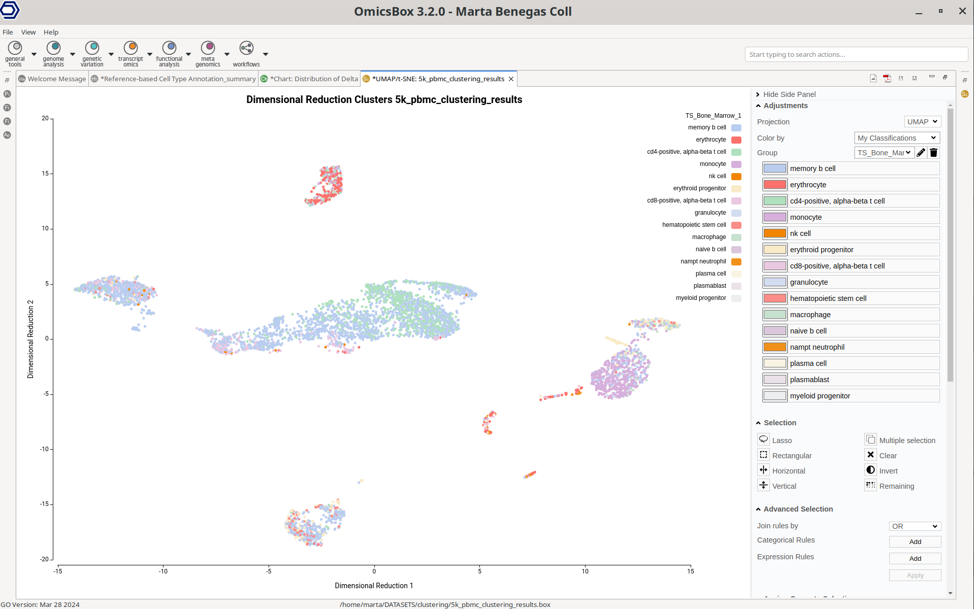 The main result is an updated clustering object with the cell-type predictions stored in the cell metadata. The new annotations can be seen in the UMAP/tSNE viewer (Figure 5). The new annotation will be named as the input reference file. In addition, a second annotation with the suffix "_pruned" will be generated as well. In this annotation, the cells that have not passed the pruning thresholds will be labeled as "Pruned". This visualization is useful to see if the pruned labels are more present in a particular cell type or if they are distributed along all the cell types. The former case may indicate that the real cell type of the cells labeled as "Pruned" is not present on the reference dataset. This visualization also aids in identifying the amount of pruned labels visually.