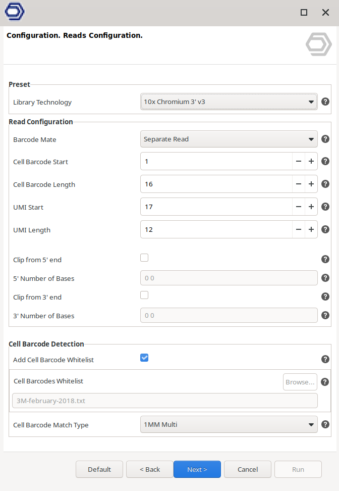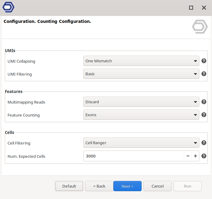 The pipeline to obtain counts from barcoded scRNA-Seq data consists of many steps, summarized in Figure 2. Each of the steps can be configured in the following wizard pages. This makes the analysis very customizable and adaptable to the dataset under study.