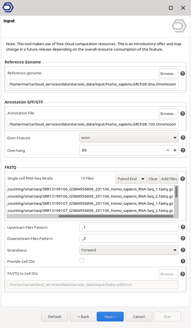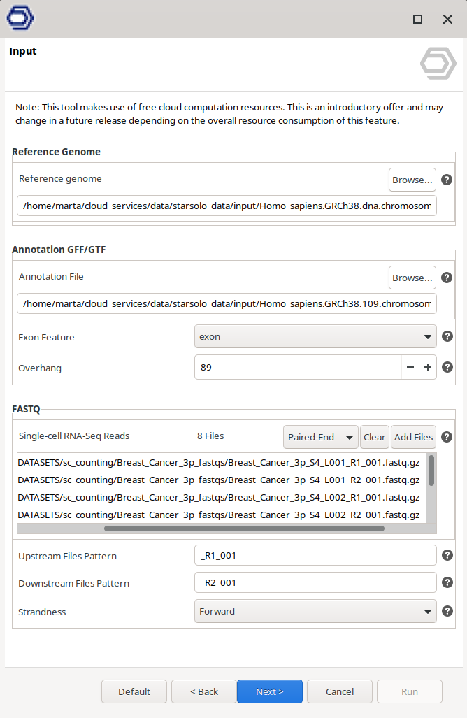 Single-cell RNA-Seq Reads. Select the FASTQ files containing the scRNA-seq reads. Each FASTQ file is supposed to belong to one individual cell. In the case of analyzing multiple samples or batches, one STARsolo run must be performed for each of them.