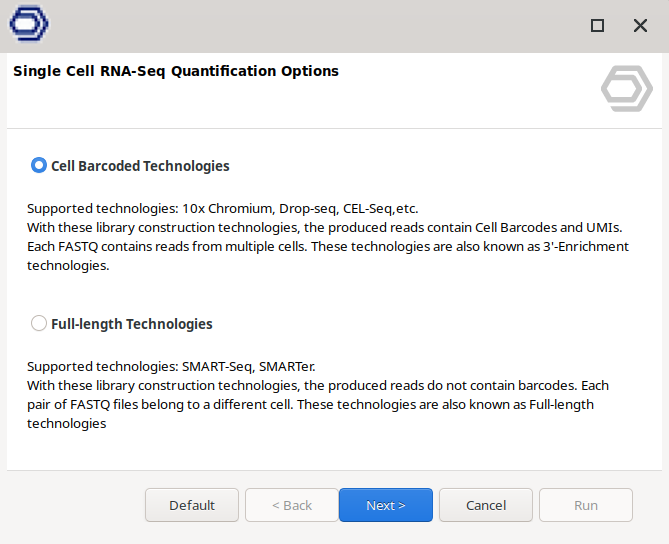 Go to transcriptomics → Single Cell RNA-Seq → Single Cell RNA-Seq Quantification. A new wizard will be opened (Figure 1). On the first wizard page, select the type of technology used during the library preparation step. Please refer to the above introductory section for more details. Depending on the type chosen, the following pages will display different configuration parameters.