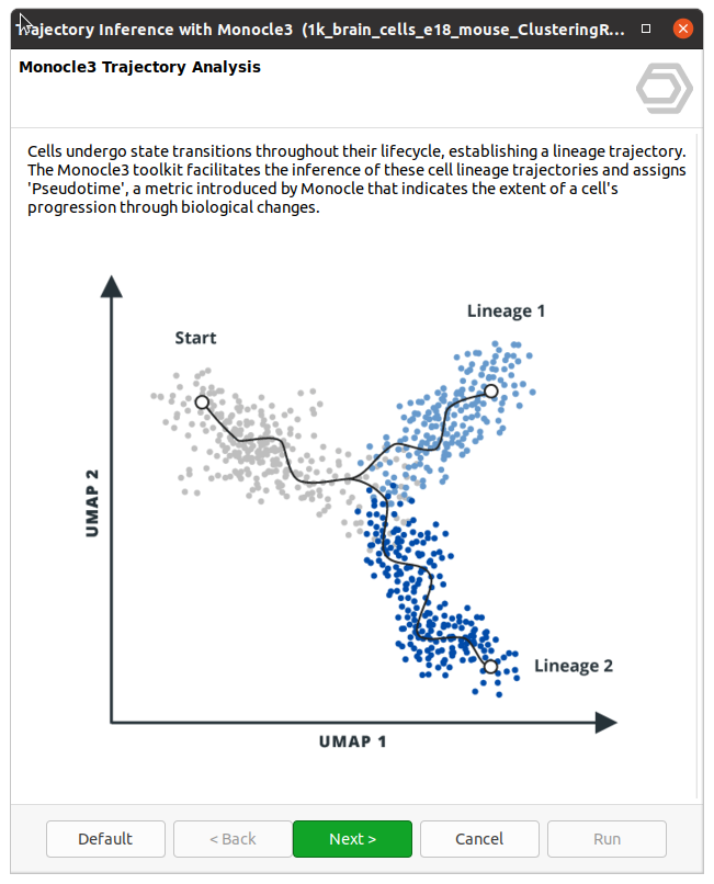 One of the essentials to perform trajectory analysis is knowing the starting or root cells. Therefore, the Monocle3 Trajectory Inference wizard is available right after the clustering analysis. After completing the scRNA-Seq Clustering, click "Trajectory Analysis" on the side panel to initiate Monocle3 (refer to Figure 2).