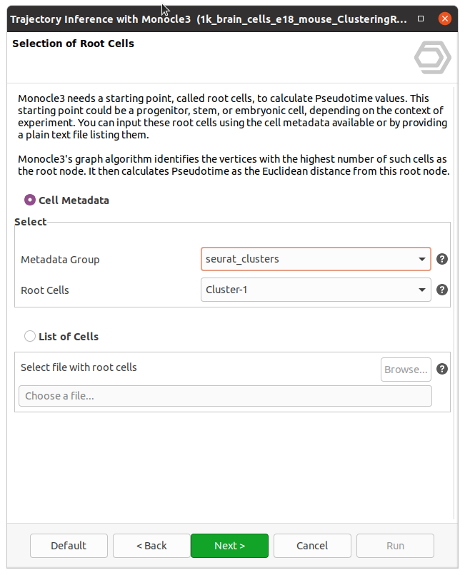 - List of Root Cells: Supply a text file with the list of cell IDs as root cells (with one name per line). These cells act as the starting points for the trajectory.