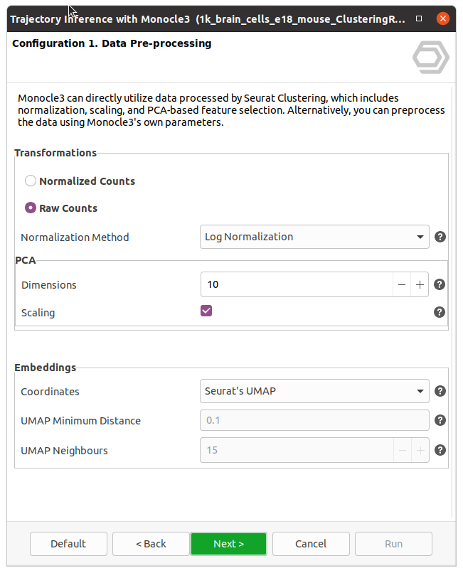 Transformations: Monocle3 can perform transformations independently or use the transformation applied during Seurat’s clustering analysis. When "Raw counts" is selected, the following options are available to fine-tune normalization and feature selection.