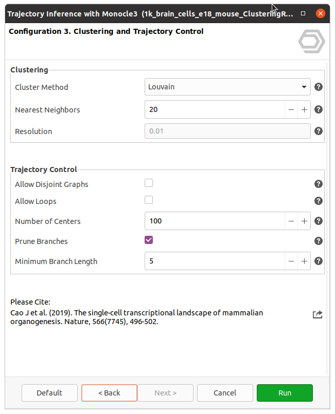 Cluster Method: Select the algorithm for clustering. If "Seurat-Clusters" is selected, the cluster labels from Seurat clustering results are transferred to the Monocle3. The other options are "Louvain Clustering" and "Leiden Clustering", for which the following parameters are available: