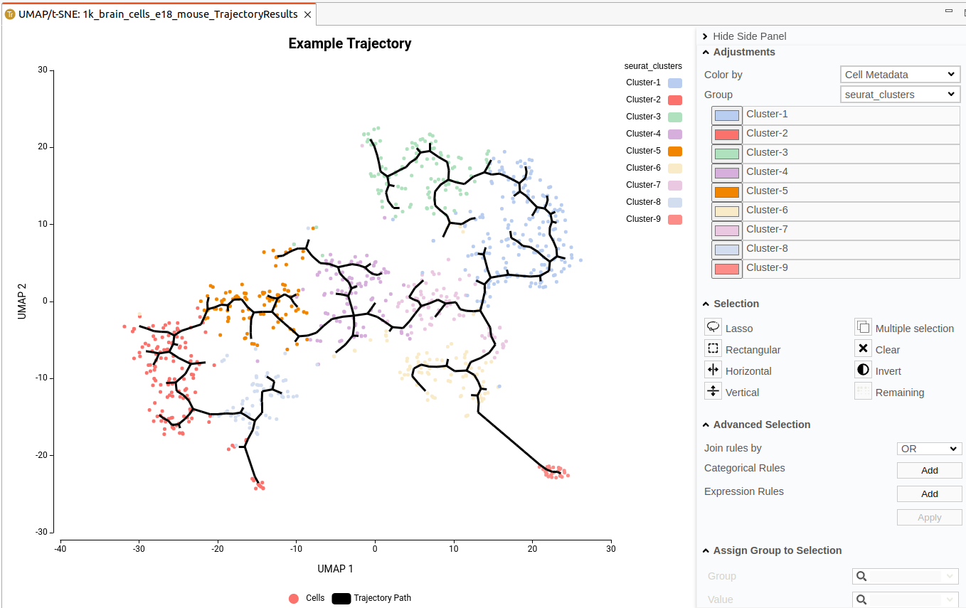 Figure 2. Trajectory Inference with Monocle3, available as the side panel option of scRNA-Seq Clustering output (After Seurat Clustering Analysis)