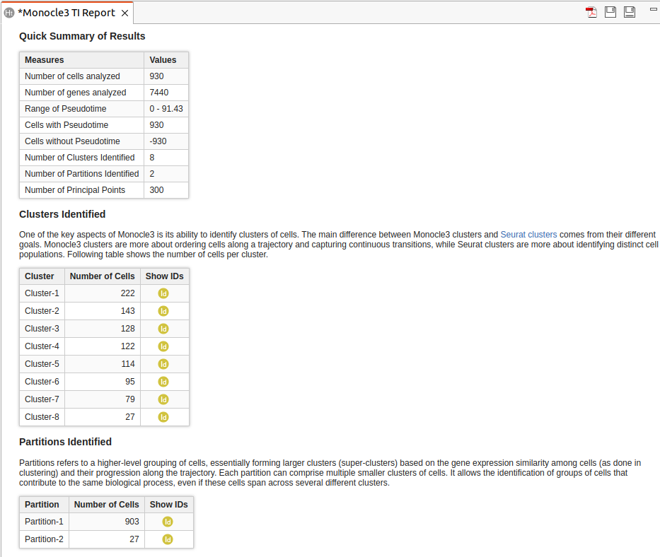 Monocle3 in OmicsBox delivers several outputs aligned with a conventional trajectory analysis. These outputs comprise a primary output table, three key plots, and a succinct report detailing the parameters used and the results obtained.