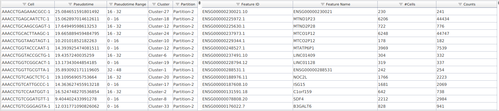 - Pseudotime: The pseudotime assigned to each cell by Monocle3. Cells not allocated a pseudotime will not have a value in this column.