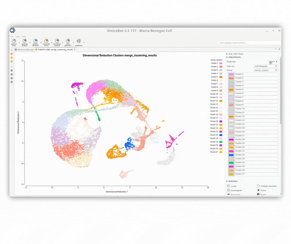 The UMAP/tSNE viewer displays the cells in a dimensional reduction space (UMAP or tSNE). These coordinates are obtained during Clustering or Trajectory analysis. The cells (dots) can be colored by different features. Moreover, they can be selected and added to new custom groups (Figure 1).