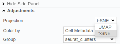 - Projection. Select which dimensional reduction space to plot: UMAP or tSNE (Figure 2). This will change the coordinates of the cells.