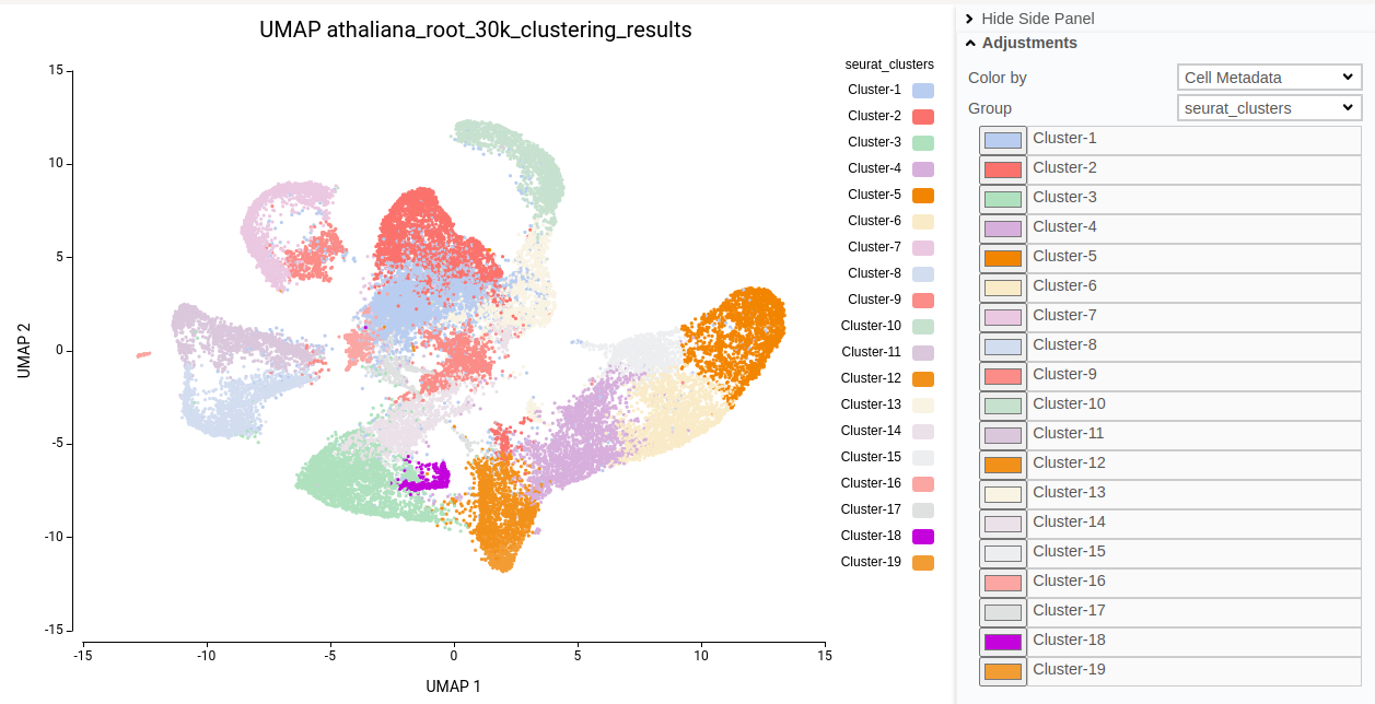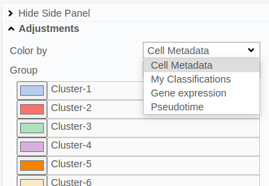 This category includes groups obtained by Clustering or Trajectory results (Figure 4-A). Clustering results include the "seurat_clusters" groups. Trajectory results include "monocle_clusters", "monocle_partitions", and "ptime_ranges" groups. The levels appearing on the Side Panel and the plot’s legend will change according to the selected group (Figure 5).