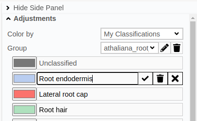 This section allows selecting cells directly on the UMAP/tSNE. The selection tools are available independently of which category is selected in the "Adjustments" section.