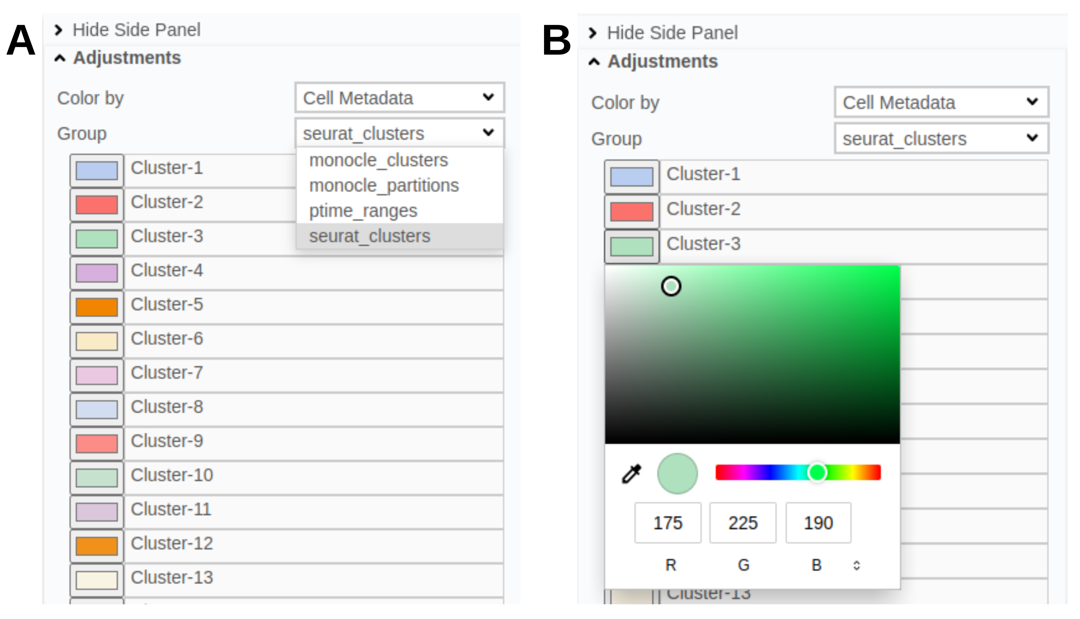 Figure 4. Cell Metadata groups (A) and how to modify the color of a group (B).