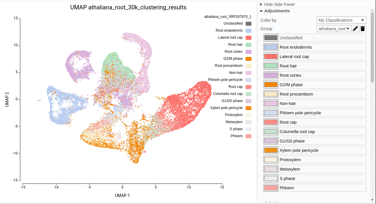 - My Classifications. Color cells by the output of Cell Type Annotation or custom groups. These cell metadata groups can be modified.