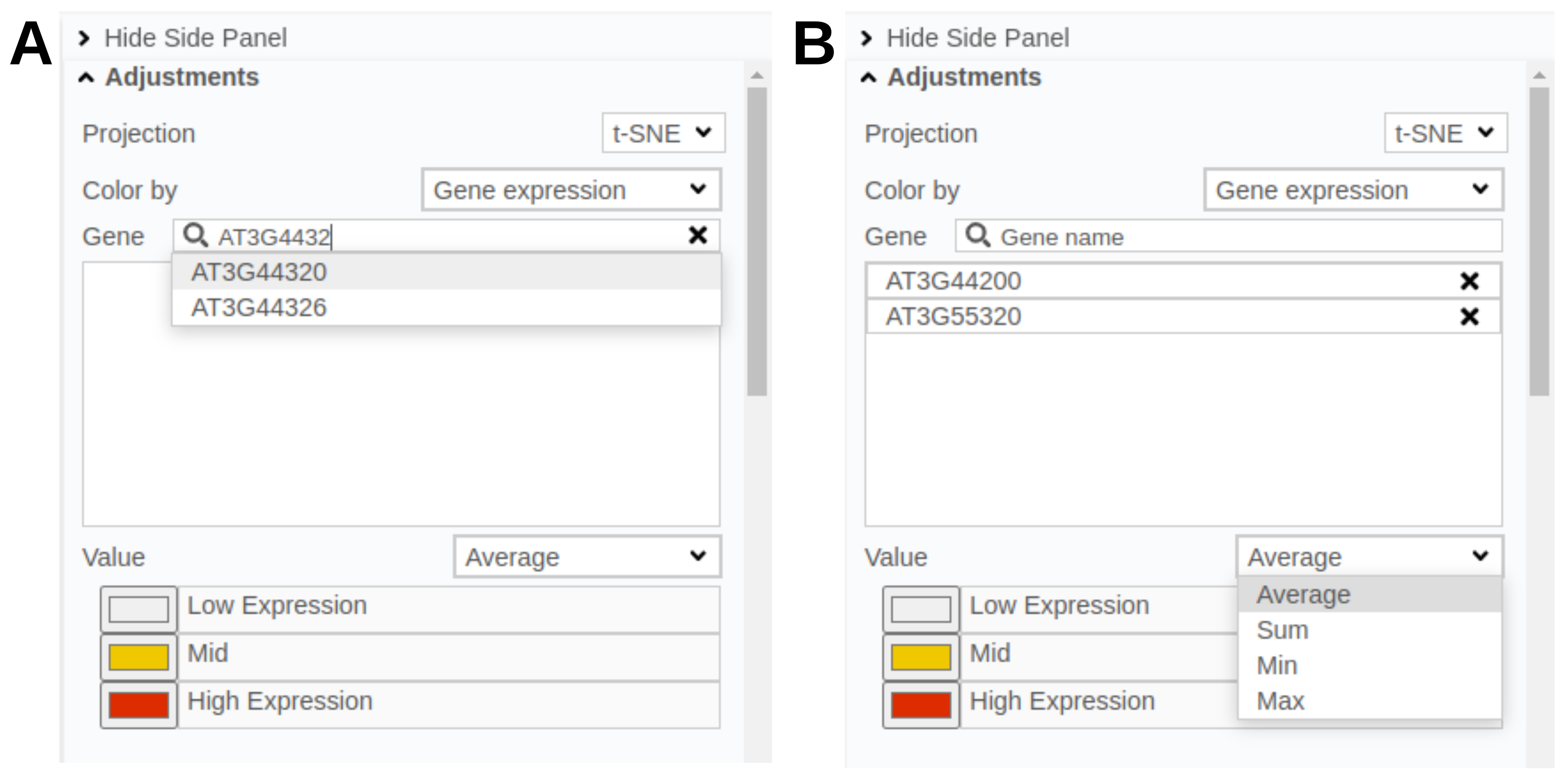More than one gene can be specified while plotting. In this case, it is possible to select how to summarize the expression values for each cell: by computing the average, the sum of all expressions, taking the minimum value, or taking the maximum value (Figure 9-B).
