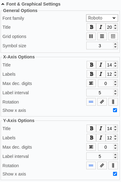 This section controls the general settings of the plot appearance. E.g: font family and size for each axis and title, the size of the dots, wether to include grids or not, etc.