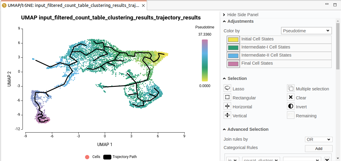 This category will change the display of the section below. Cells will be colored according to their pseudotime value (Figure 10). This option will be available only after Trajectory Analysis.