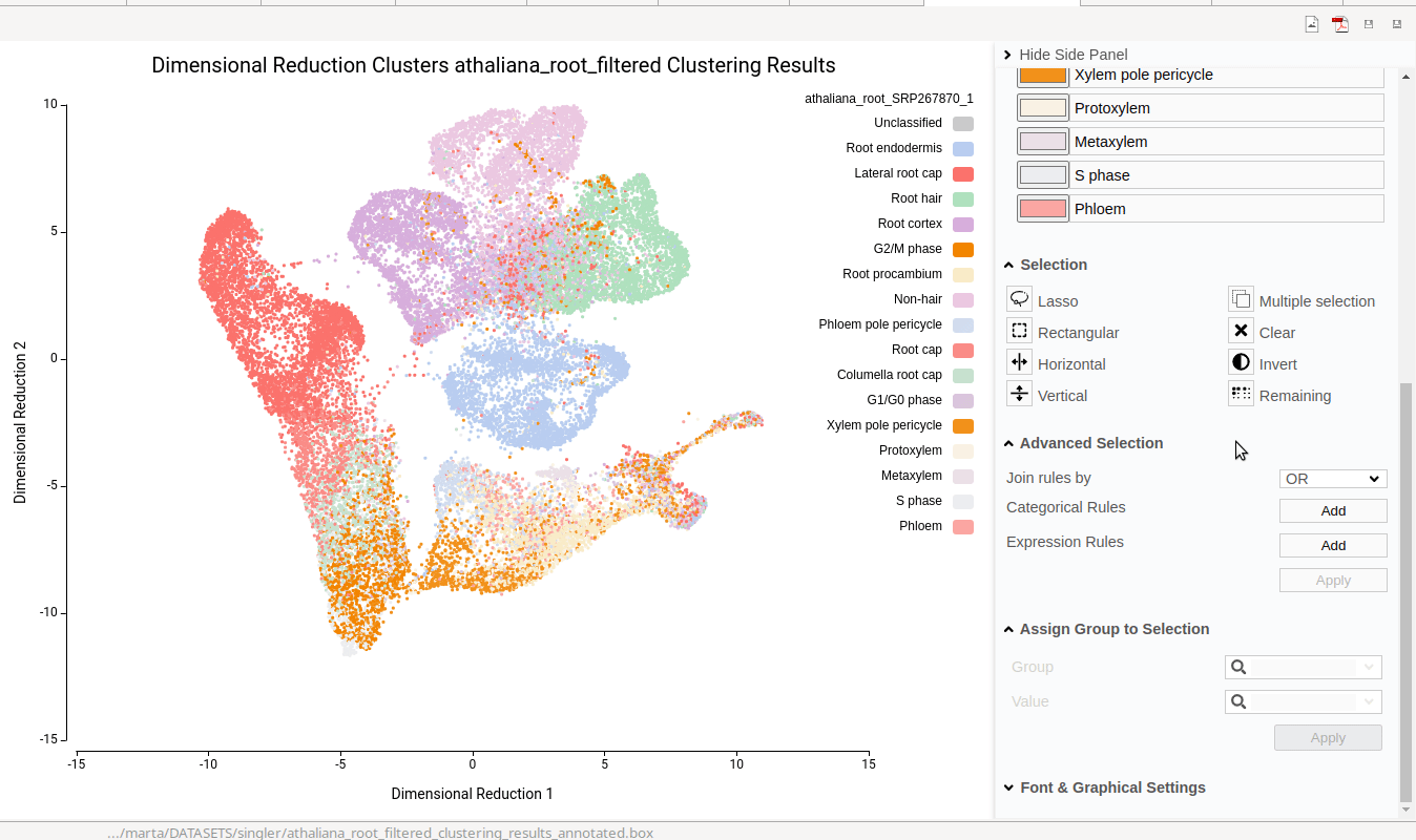 Figure 18. Example behavior of the "Advance Selection" section. Cells belonging to the "Root endodermis" group and with an AT3G55230 expression level greater than 1 are selected.