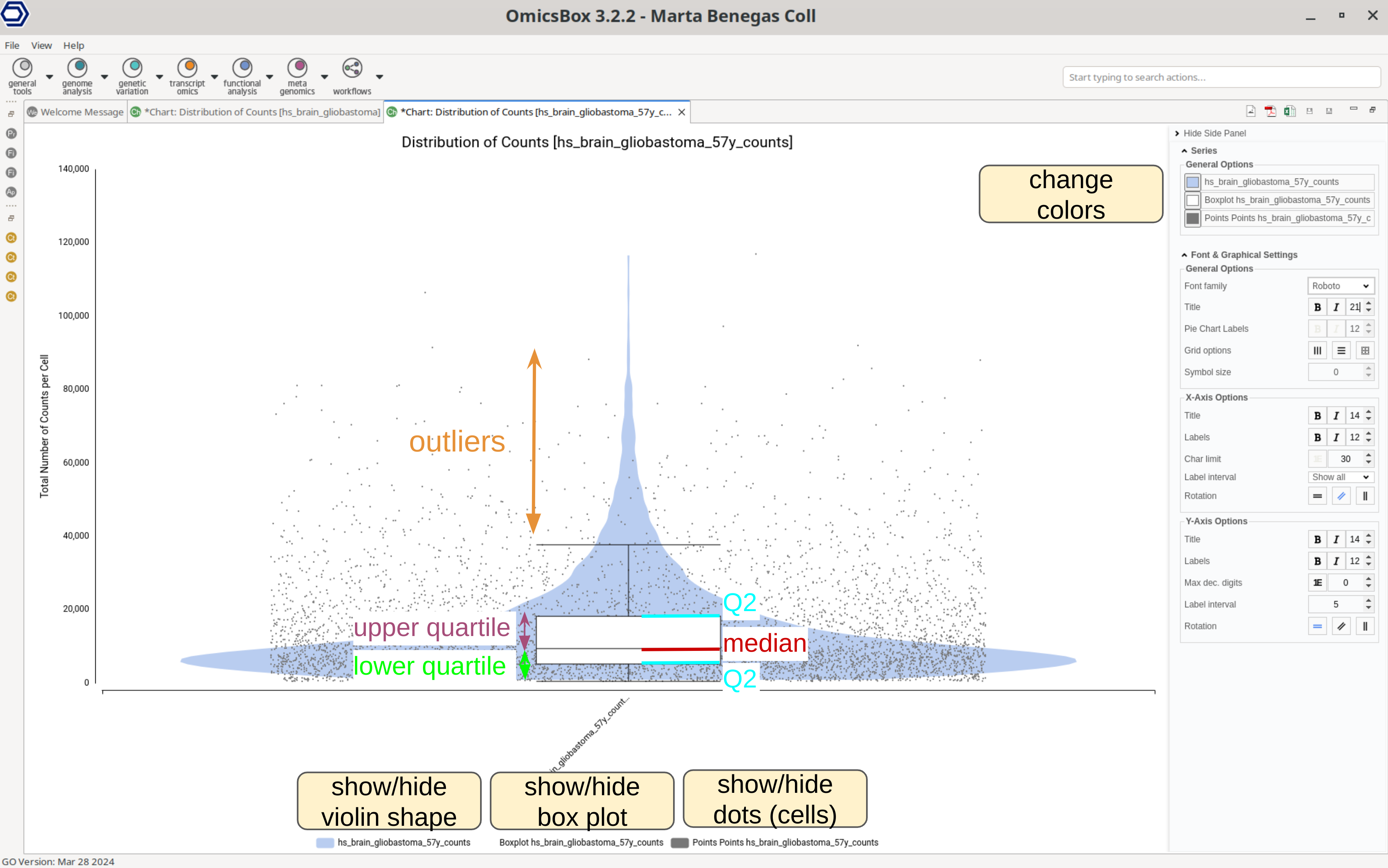 Violin plots showing the distribution of different cells' statistics. Each dot represents a cell, the position on the Y-axis is the value of the given statistic, while the position on the X-axis is arbitrary. The width of the violin (background color) shows the density of dots on each region in the Y-axis. The box plot shows the median, the interquartile range, and the outliers (Figure 2).