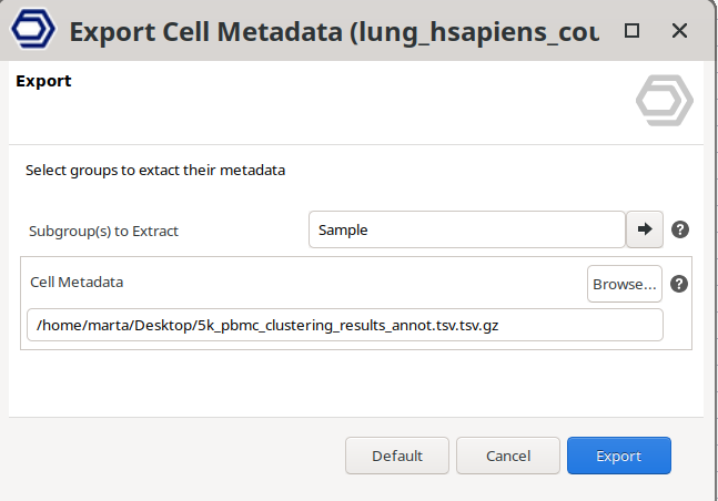 - Export Cell Metadata. Generate a tab-delimited text file with cell metadata. The first line is the header and one line per cell. Select on the "Subgroup(s) to Extract" which metadata from the object should be included in the file (Figure 6).