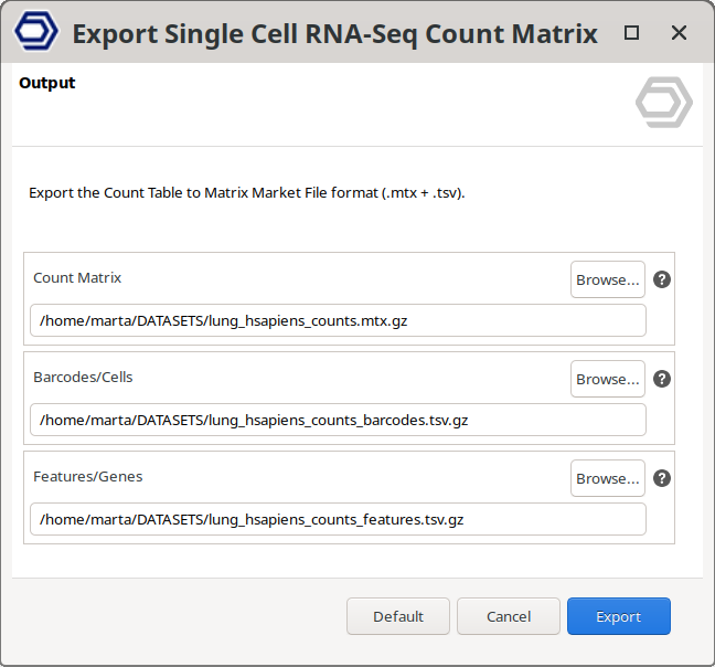 - Export Count Matrix:Export the count matrix in Matrix Market File format. Three locations must be specified in the wizard (Figure 5) in order to save the mtx (non-zero counts coordinates), barcodes, and features files.