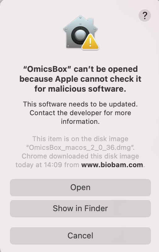 Click Open and follow the instructions to complete the installation. OmicsBox will be installed in /Applications/OmicsBox by default