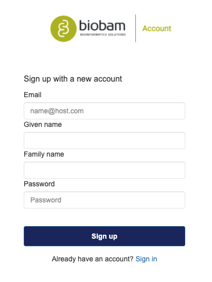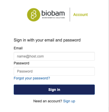 The login account and credentials (email and password) are the same as the ones used on the BioBam Account website. If you do not have a BioBam Account you can now create one from within OmicsBox using the "Sign up" option.