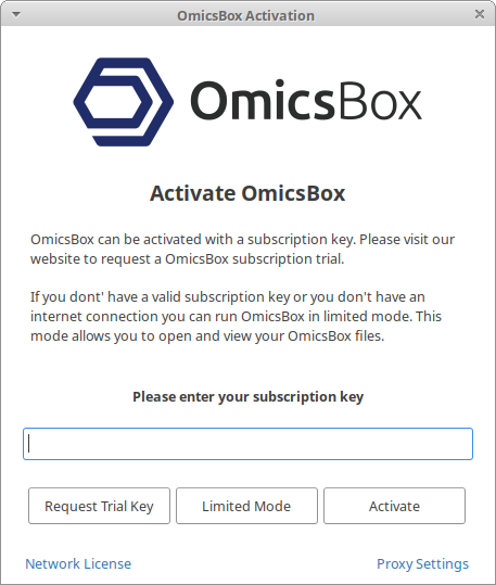 OmicsBox can be fully activated with a subscription key, which can be obtained from the BioBam website. A subscription can activate the different modules of the software that have been purchased. Additionally, it will give access to the cloud services like analyzing the data in the BioBam Cloud infrastructure, updates and support. More details about the advantages of a subscription can be found online on our website.