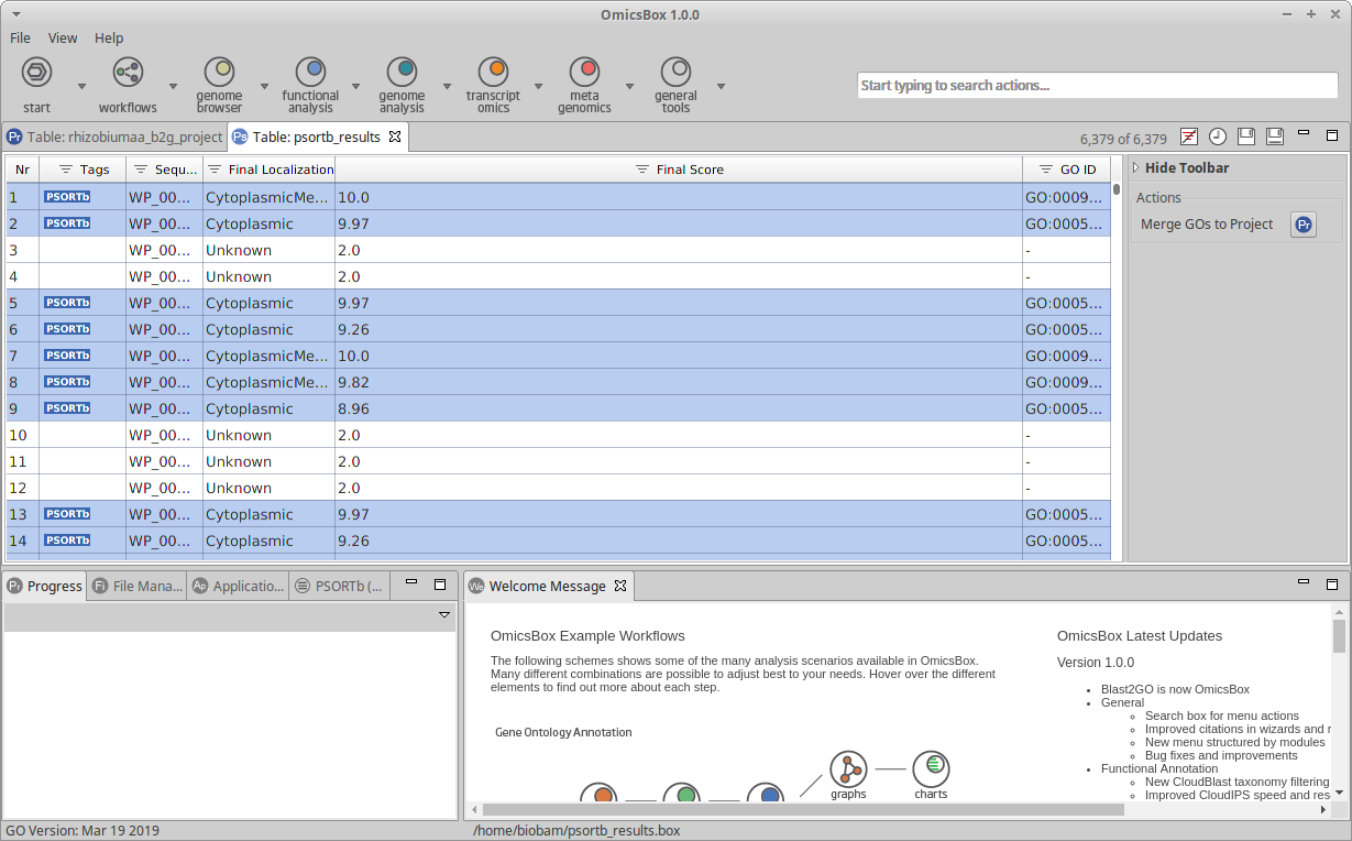 OmicsBox allows assigning sub-cellular localization sites to proteins based on their amino acid sequence via PSORTb. PSORTb is an algorithm that can be applied to bacteria or archaea protein sequences and uses a probabilistic system to predict the most probable localization. Once sites are predicted, their corresponding cellular component GO terms can be merged with the already existing annotations.