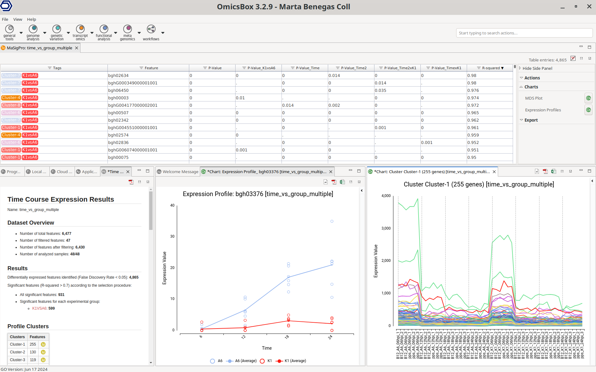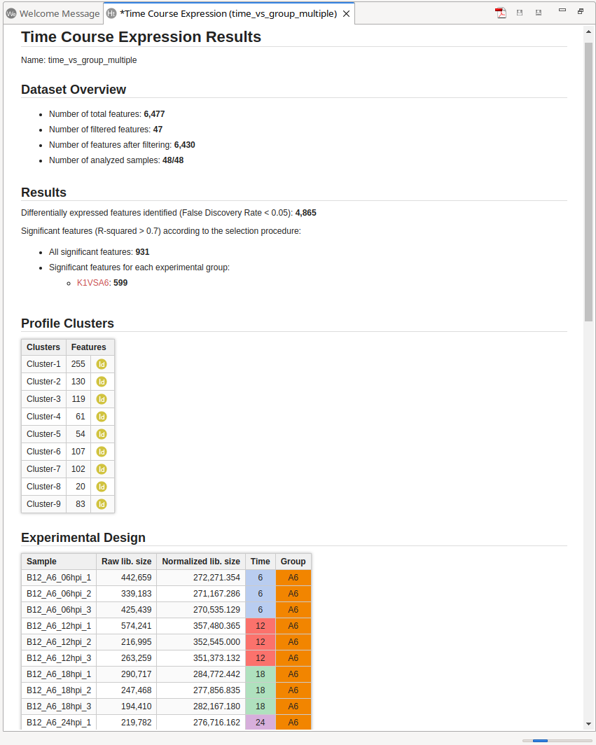 Additionally, a report will be open that shows a summary of the time-course expression analysis results, including the cluster of features with similar expression profiles (Figure 9).