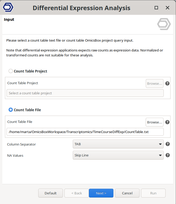 Go to transcriptomics → Differential Expression Analysis. If there’s no count table project opened, the first wizard page (Figure 3) will ask to upload either a Count Table Project (.box file) or a Count Table File (.txt, .csv, or .tsv file). On the second wizard page, choose the "Time Course Expression Analysis" option (Figure 4).