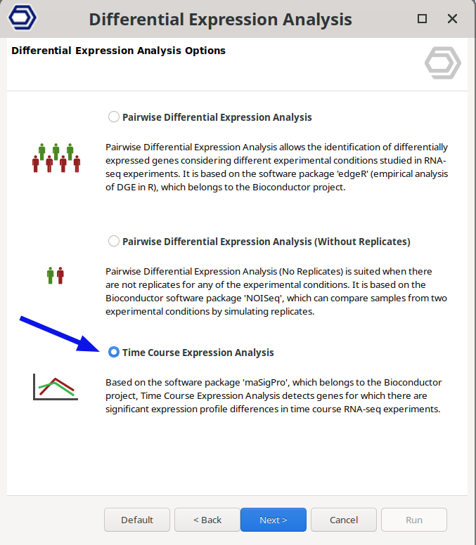If a count table is already loaded in OmicsBox (see above section), this one will be used to perform the analysis. In this case, the analysis can be run by both clicking on the "Diff. Expression Analysis" in the Side Panel or by going to transcriptomics → Differential Expression Analysis. Now the first wizard page will ask to select the type of differential expression analysis (Figure 4).