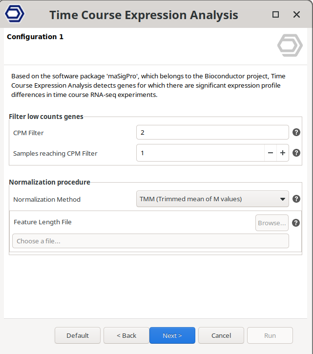 This tool is designed to perform time-course expression analysis of count data arising from RNA-seq technology. Based on the maSigPro program, this application allows the detection of genomic features (e.g. genes) with significant temporal expression changes and significant differences between experimental groups. The software package maSigPro, which belongs to the Bioconductor project, implements a two steps regression strategy to find genes for which there are significant expression profile differences in time course RNA-seq experiments.
