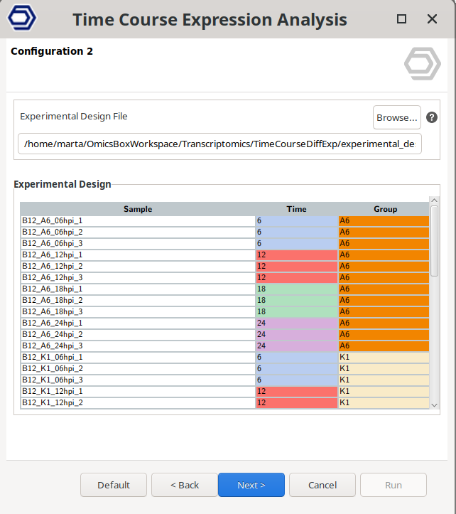 - Experimental design file: Select your .txt file containing your experiment descriptors associated with each sample in tab-delimited format. As shown below, rows correspond to samples and columns to experimental descriptors. A column must contain the associated time points for each sample, and another column should show the assignment of samples to experimental groups. Make sure that the names in the first column of the experimental design table are exactly the same as the sample names in the count table header. If your experimental design file has fewer samples than the count table, only the samples contained in this file will be analyzed.