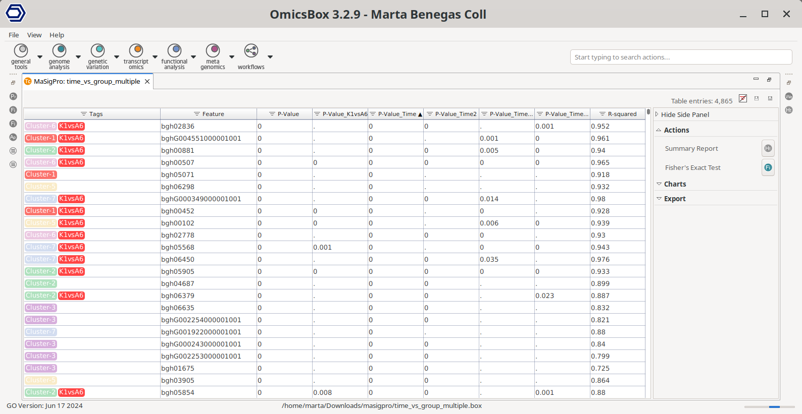 Cluster tags. There will be as many cluster tags as the number specified in the "Number of Clusters" parameter. Each cluster is assigned a different color. Genes found significantly expressed over time are then grouped by their expression profile by the clustering algorithm. Thus, genes labeled with i.e. "Cluster-1" tag, change their expression over time and, moreover, with a similar trend.