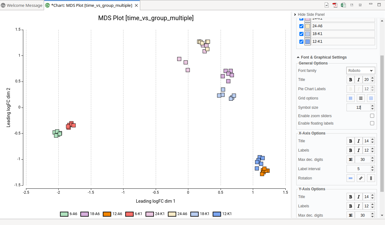 Generates a two-dimensional scatterplot in which the distances represent the typical log2 fold changes between samples. You can select an experimental factor by which you want to color the MDS graphic (Figure 11).
