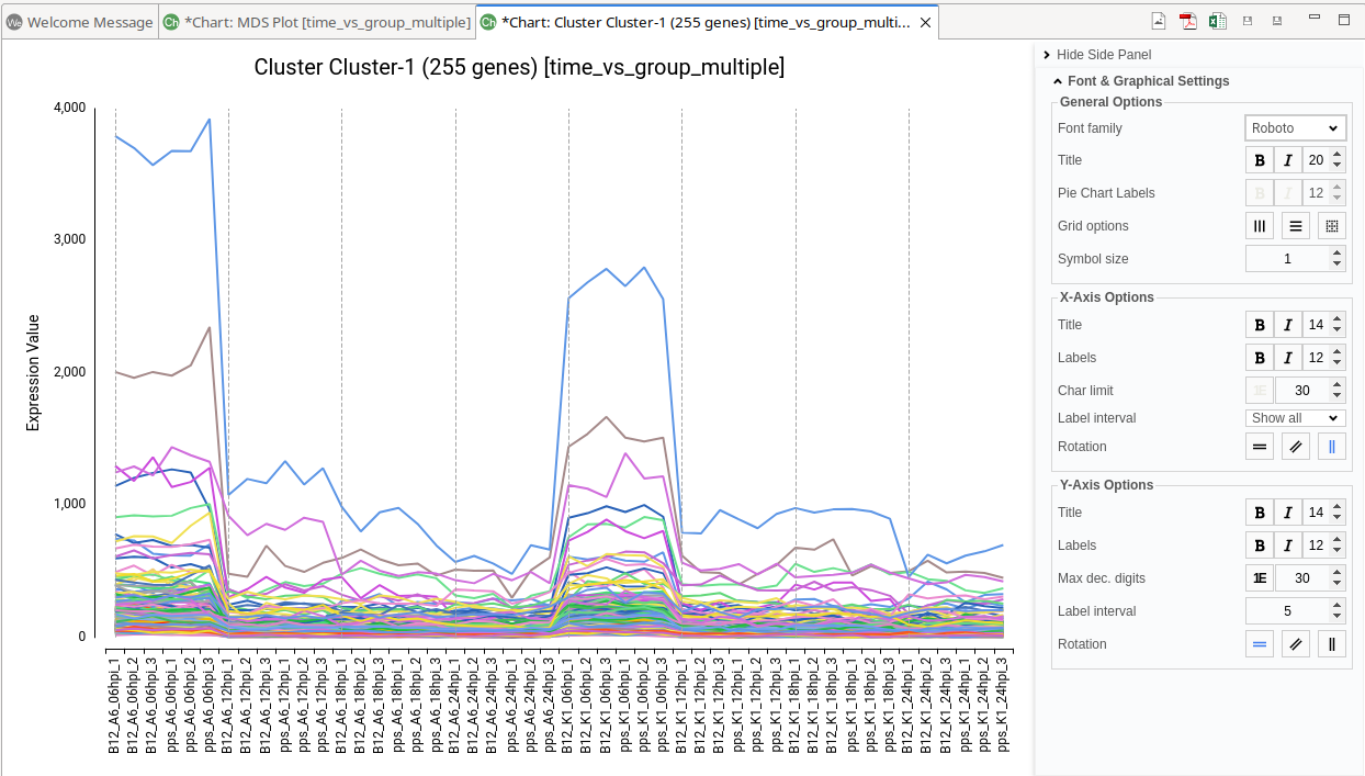 Different statistics charts can be generated for a global visualization of the results. These charts can be found under the Side Panelof the TimeCourse Results viewer.