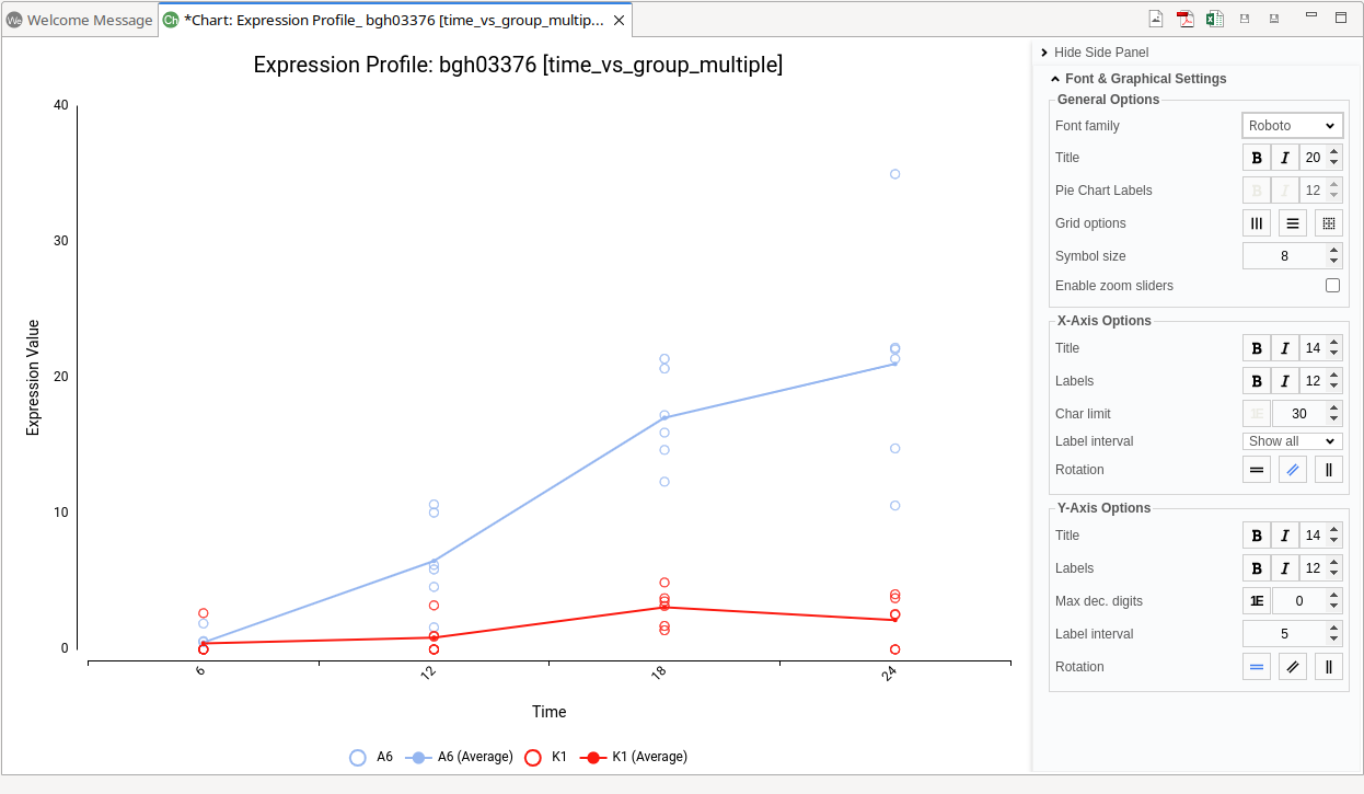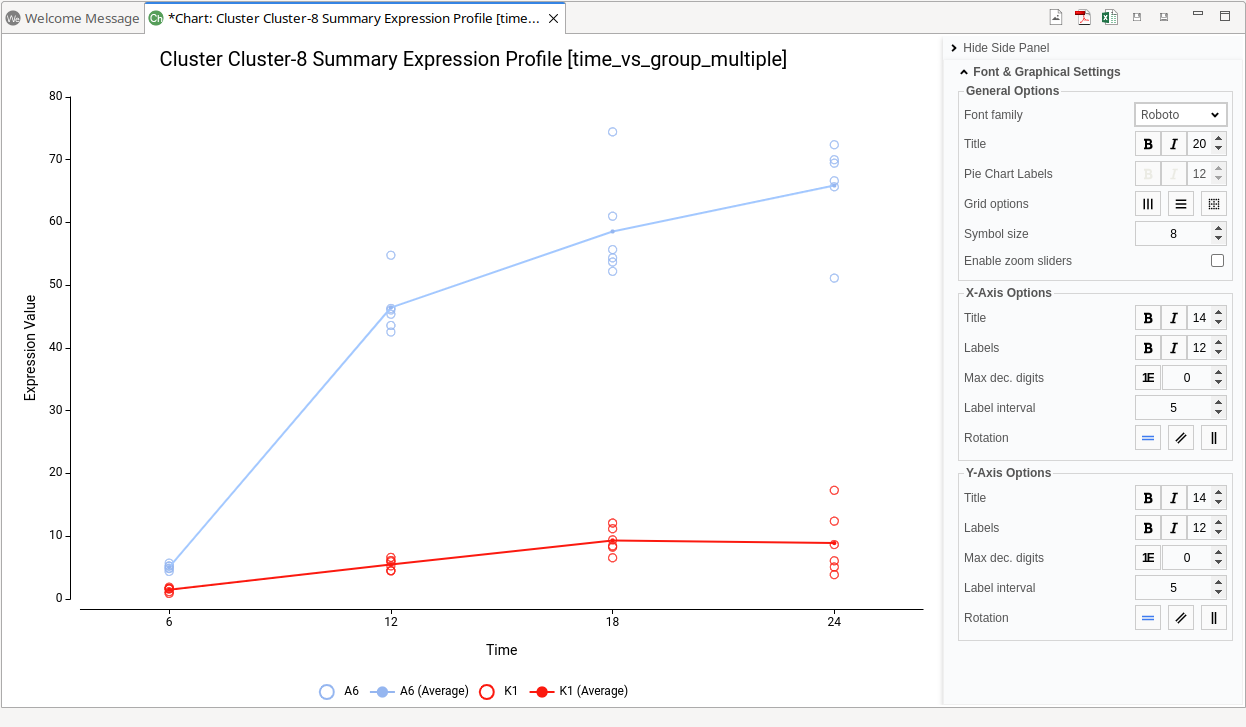 Graph of gene expression profiles over time for a particular gene (Figure 14). It is possible to see them by right-clicking on the chosen gene and selecting the "Show Expression Profile" option.
