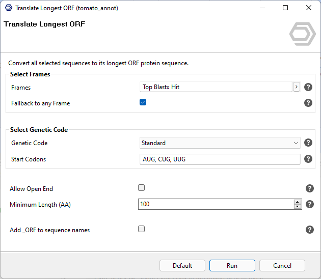 Convert all selected sequences to its longest ORF protein sequence. The tag "_ORF'' will be added to the sequence names. Use the batch rename function to undo the name change. The user may select the reading frame, the genetic code depending to the species that will be considered to the prediction.