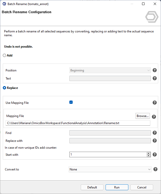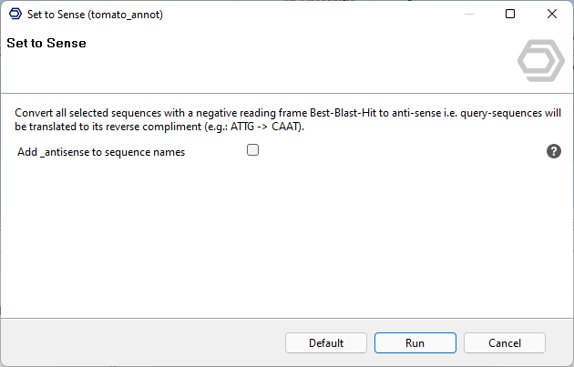 Convert all selected sequences with a negative reading frame Best-Blast-Hit to anti-sense i.e. query-sequences will be translated to its reverse complement (e.g.: ATTG ->CAAT). The tag "_antisense" will be added to the end of the sequence names. Use the batch rename function to undo the name change.