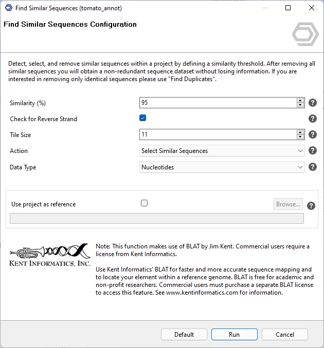 This function allows searching for similar sequences within a dataset. The search for similar sequences is done via BLAT alignments. The function searches a list of sequences against itself and reports all alignments above a certain similarity percentage. It is possible to remove similar sequences from the project or remove or to extract a less redundant result dataset into a new project.