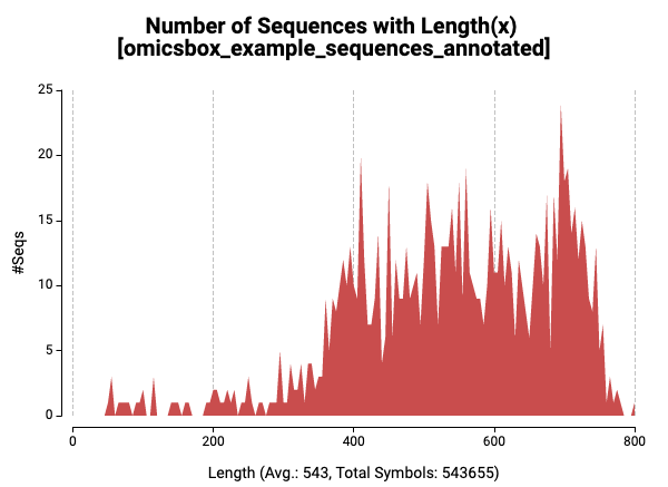- Sequence Length Distribution: Area chart showing the number of sequences for each sequence length.