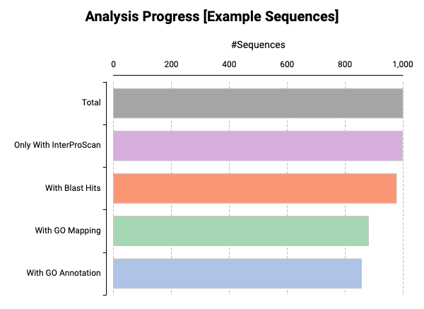 - Analysis Progress: Bar chart showing the cumulative number of sequences with Blast hits, InterProScan, GO Mapping and GO Annotation results.