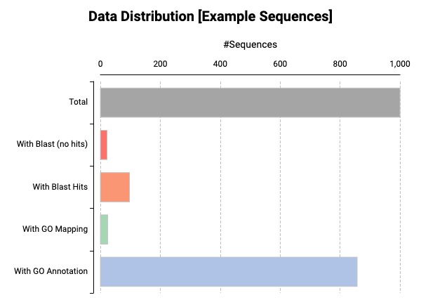 - Data distribution bar chart: Bar chart showing the number of sequences with Blast (with or without hits), GO Mapping and GO Annotation results.