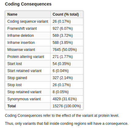 - Consequence: effect of that variant. This consequence will be one among the ones that appeared in the report.